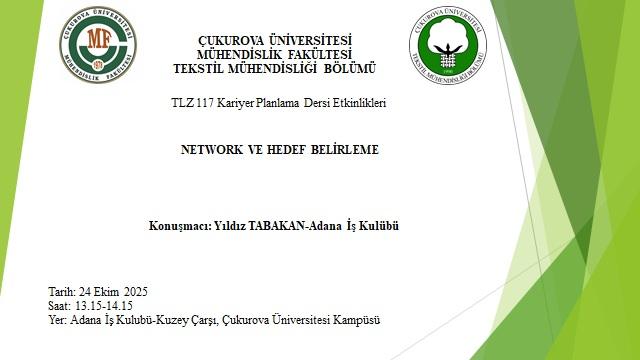 TLZ 117 Kariyer Planlama Dersi Etkinlikleri kapsamında, 24 Ekim 2025 tarihinde Adana Çalışma ve İş Kurumu İl Müdürlüğü'nde İş Kulübü Lideri Yıldız TABAKAN tarafından "NETWORK VE HEDEF BELİRLEME" konulu seminer verilmiştir.