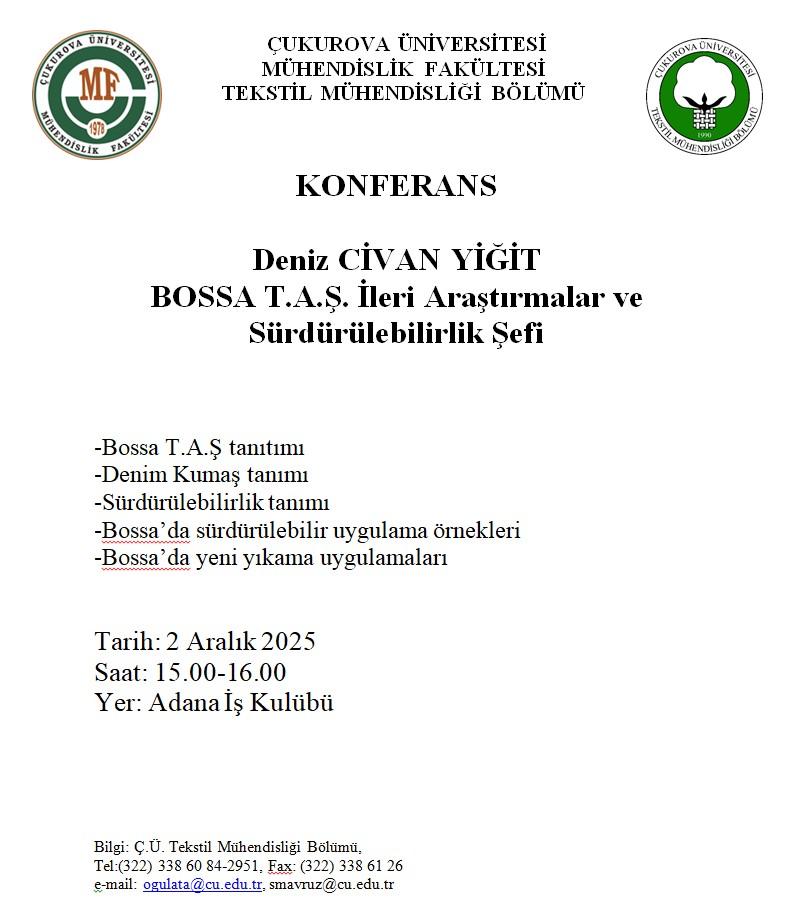 TLS 433 Denim Teknolojisi Dersi kapsamında BOSSA T.A.Ş. İleri Araştırmalar ve Sürdürülebilirlik Şefi Deniz Civan Yiğit tarafından denimde sürdürülebilir uygulama örnekleri ve denimde yeni yıkama uygulamaları konusunda konferans gerçekleştirilmiştir.