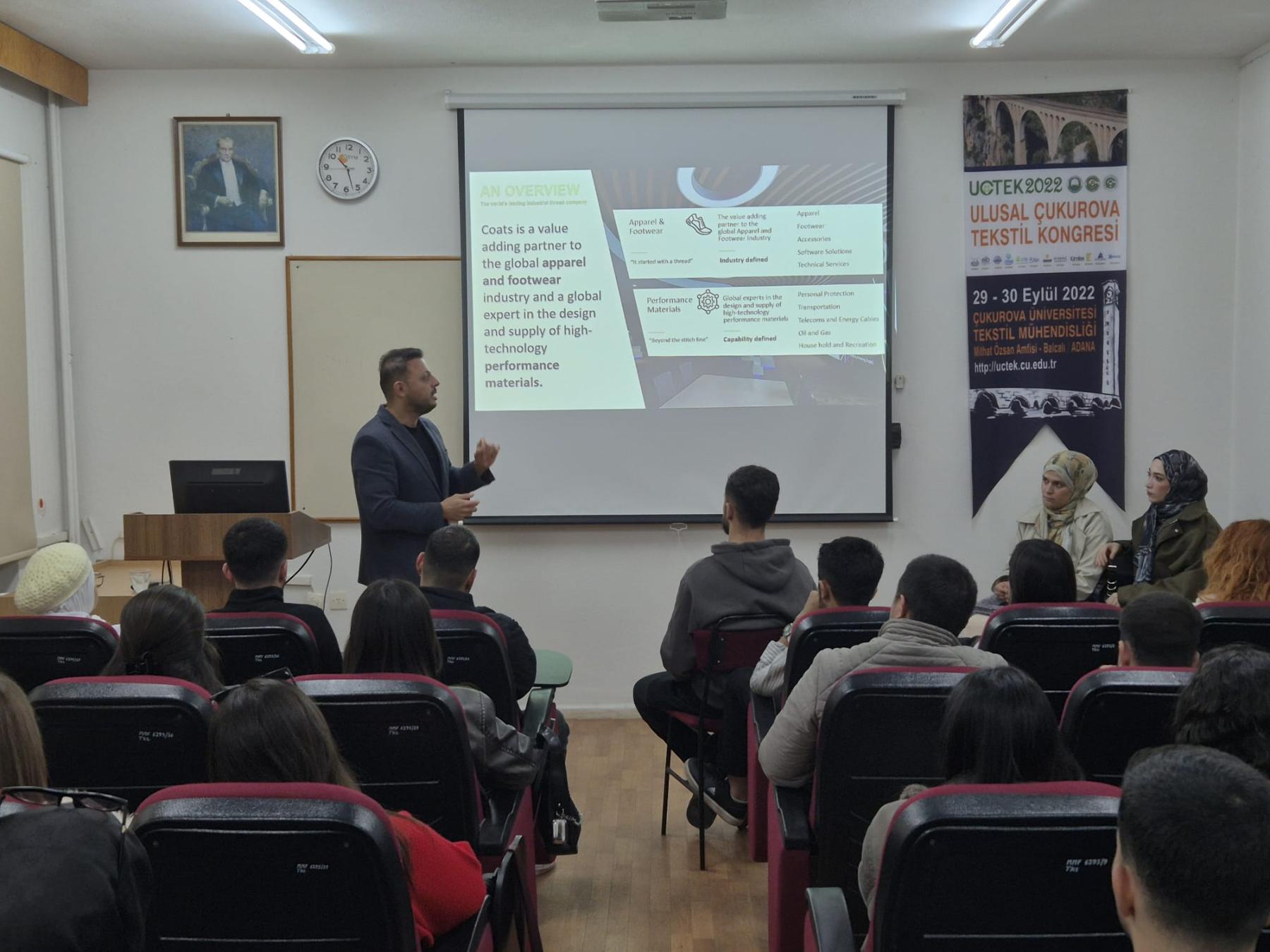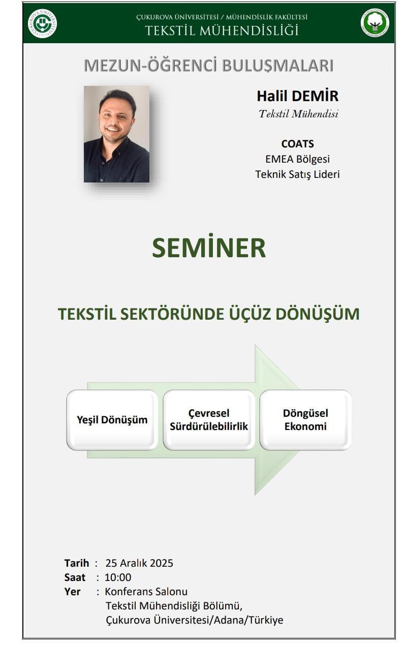 Bölümümüzde 25 Aralık 2025 tarihinde, “Mezun-Öğrenci Buluşmaları” etkinliği kapsamında lisans öğretimindeki öğrencilerimize yönelik, mezunumuz Halil Demir tarafından “ Tekstil Sektöründe Üçüz Dönüşüm” konulu bir seminer verilmiştir.